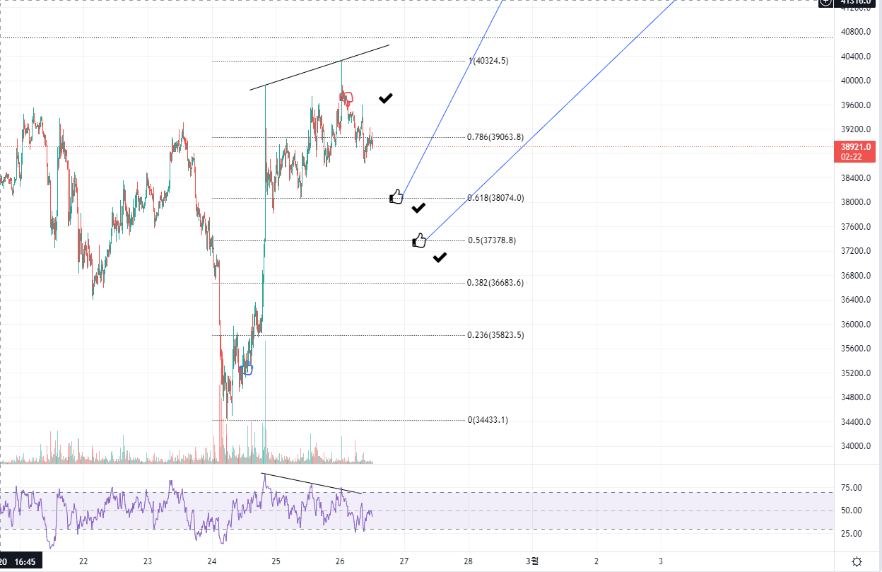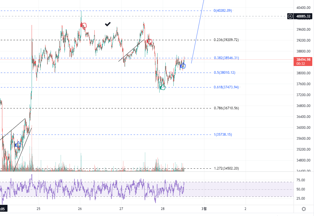 매매는 37.4K 익절 후 개인적인 사정으로 몇시간 가량 차트를 못봐 뒤늦게 38.2K 부분에서 롱을 진입하였네요..ㅠ
